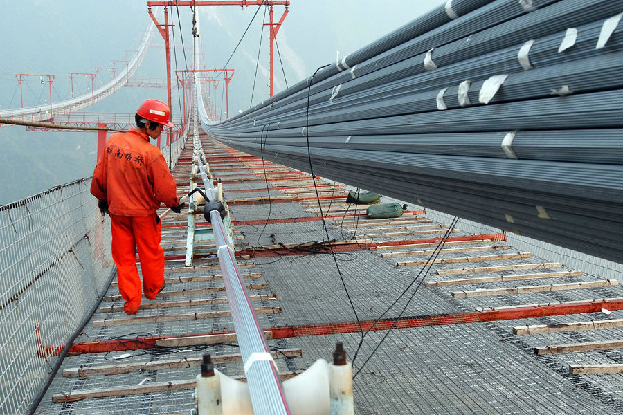 矮寨特大懸索橋位于湖南省湘西州吉首市矮寨鎮(zhèn)境內(nèi),距吉首市區(qū)約20公里,是國家重點規(guī)劃的8條高速公路之一——長沙至重慶通道湖南段吉(首)茶(峒)高速公路中的重點工程。工程為雙層公路、觀光通道兩用橋梁,四車道高速公路特大橋。橋型方案為鋼桁加勁梁單跨懸索橋,全長1073.65m,懸索橋的主跨為1176m,創(chuàng)造了四項************,極大地改善湘渝兩省市的交通現(xiàn)狀,對兩省市乃至中西部的對接具有極其重要的意義。