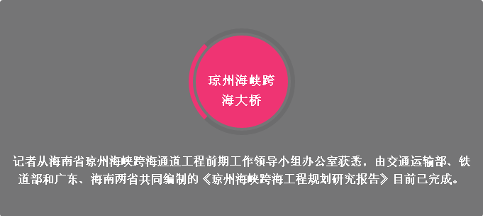 交通運輸部、鐵道部和廣東、海南兩省2015年7月8日在北京簽訂了協議,四方將在明年聯合向國家發改委報送瓊州海峽跨海通道項目建議書,瓊州海峽跨海大橋爭取在2017年開工建設大橋、2025年建成通車。